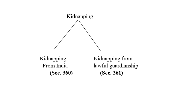 Kidnapping as the word suggest is the act of stealing a child. Under section 360 of Indian penal code,1860 there are two types of kidnapping i.e. Kidnapping from India and Kidnapping from lawful guardianship. But there may be cases when both the kinds can overlap each other. Kidnapping may be done to demand for ransom in exchange for releasing the victim, or for other illegal purposes. Kidnapping can be accompanied by bodily injury which elevates the crime to aggravated kidnappingi.
